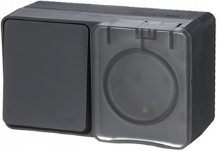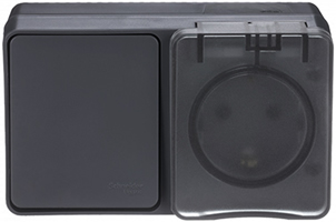 Блок Schneider Electric ATN544070 AtlasDesign Profi54 (выключатель 1-клавишный 10 А + розетка 1-местная 16 А с заземлением, шторками и защитной крышкой) открытой установки, антрацит