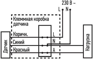 - Подключить проводники питания и нагрузки к винтовым контактам клеммной колодки датчика.