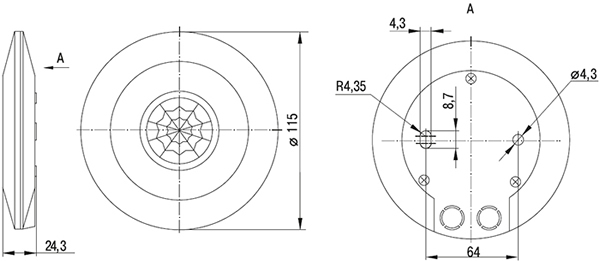 - Установить датчик на опорную поврехность (потолок, стена) и закрепить его через два отверстия в корпусе винтами самонарезающими.
