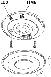 - Установить датчик на опорную поврехность (потолок, стена) и закрепить его через два отверстия в корпусе винтами самонарезающими.