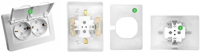 - Розетка оборудована защитным кожухом и лицевой панелью с двумя защитными крышками, обеспечивающими гарантированно надежную защиту механизма и контактной группы при использовании изделия во влажных и пыльных помещениях (2).