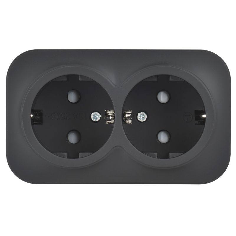 Розетка двухместная IEK РСш22-3-ХЧм Glory (16 А, IP20) открытой установки, с заземлением и защитными шторками, черный матовый