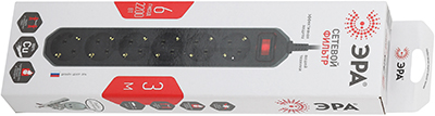 Сетевой фильтр шестиместный 3 м USF-6es-3m-B-BOX "Эра" (ПВС, 10 А, базовый уровень защиты), с заземлением, с выключателем, черный