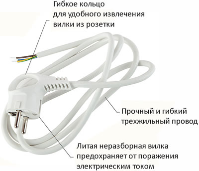 Провод шнура питания состоит из скрученных жил с надежной ПВХ оболочкой.