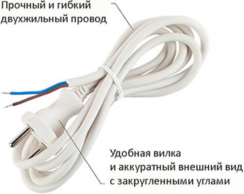 Провод шнура питания состоит из скрученных жил с надежной ПВХ оболочкой.