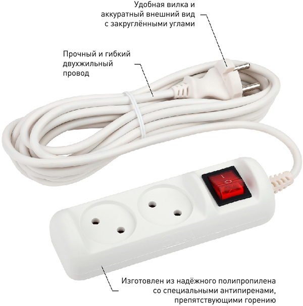 Удлинитель бытовой без заземления предназначен для подключения электроприборов и электроинструментов мощностью до 2,2 кВт.