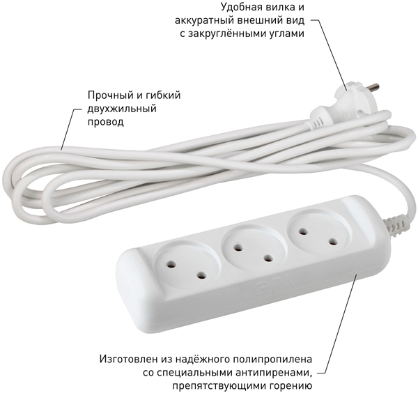 Удлинитель трехместный 3 м "Эра" UХ(6)-3-3m (6 А, 250 В, ПВС 2 х 0,75 кв.мм), белый
