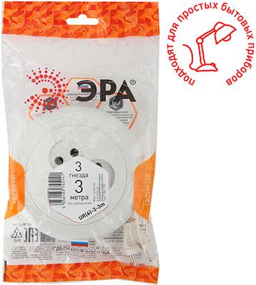 Удлинитель электрический трехместный UR(6)-3-3m "Эра" (6 А, ШВВП 2 x 0,75 кв.мм) без заземления, на рулетке, 3 м