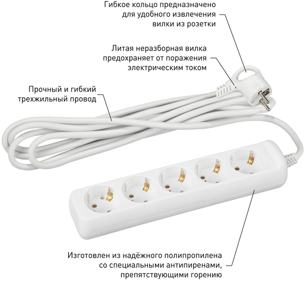 | Тип изделия | удлинитель бытовой с заземляющими контактами, без защитных шторок |