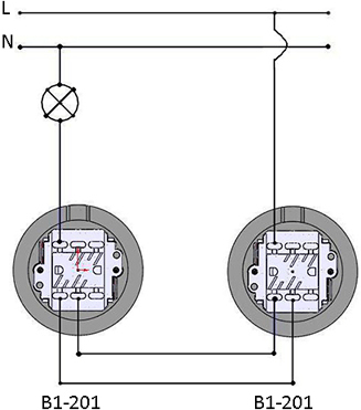 В паре со вторым таким же устройством можно организовать удобную схему управления освещением, которая подойдет для длинных коридоров, лестниц, проходных комнат, а также для спален.