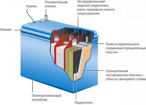 - Функцию резервуара для электролита и одновременно сепаратора выполняет стекловолоконный материал AGM (Absorbent Glass Mat), который электрически разделяет положительную и отрицательную пластины.