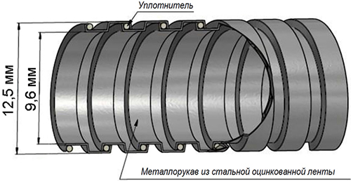 Наличие уплотнения не делает металлорукав герметичным, но позволяет использовать его в системах вентиляции и для транспортировки крупнодисперсных сыпучих веществ.