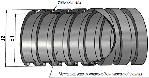 Наличие уплотнения не делает металлорукав герметичным, но позволяет использовать его в системах вентиляции и для транспортировки крупнодисперсных сыпучих веществ.