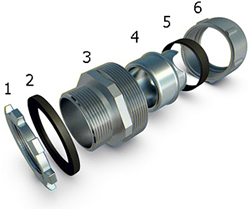 1 - заземляющая гайка. 2 - уплотнитель. 3 - корпус. 4 - оконцеватель. 5 - корпус. 6 - накидная гайка. |