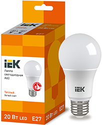 Лампа светодиодная IEK LLE-A60-20-230-30-E27 (A60 стандарт, E27, 20 Вт, 1800 лм), цвет свечения теплый белый