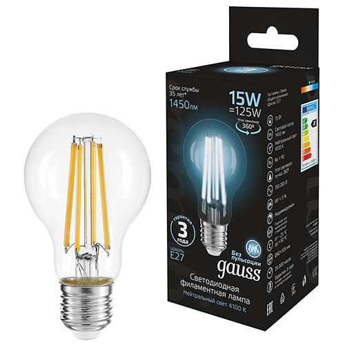 Лампа светодиодная Gauss Filament 102902215 (А60, Е27, 15 Вт, 1450 лм, 4100 К, прозрачная колба)