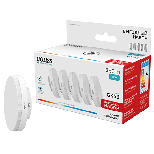 Лампы светодиодные Gauss 84822V Elementary (tablet, GX53, 12 Вт, 860 лм, 4100 К), комплект 5 шт.