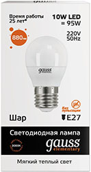Лампа светодиодная Gauss Elementary 53210 (10 Вт, E27, G45 шар, 880 лм, 3000 К)