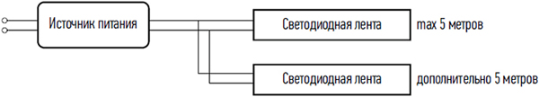 Р = Рленты х Lдлина ленты. Р = 6,0 Вт/м х 5 м = 30 Вт.