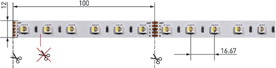 Ленту можно разрезать только в обозначенных местах по линии между контактными площадками для пайки.