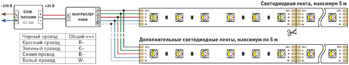 Схема подключения нескольких светодиодных лент с двух сторон: