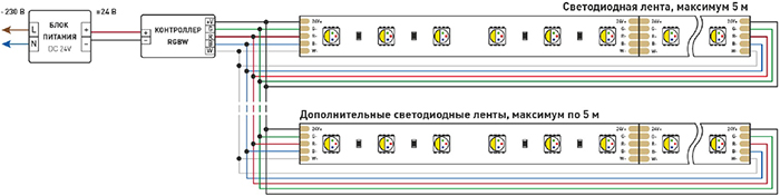Схема подключения нескольких светодиодных лент с одной стороны: