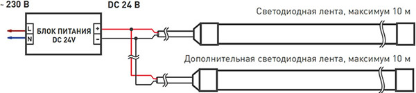 При подключении большего количества ленты подавайте питание на каждые 10 м отдельным кабелем или от отдельного источника питания.