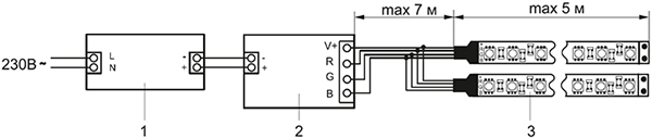 1 - блок питания. 2 - RGB контроллер. 3 - RGB светодиодная лента. |