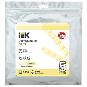 Лента светодиодная IEK LSR-5050WW60-14,4-IP65-12В PRO (SMD 5050, 12 В, 14,4 Вт/м, 60 led/м, IP65), цвет свечения теплый белый