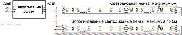 - Питание ленты осуществляется постоянным стабилизированным напряжением 24 В.
