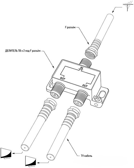 Сплиттер имеет два выхода для сигнала, подключается с помощью стандартных F-разъемов.