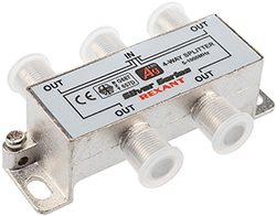 Сплиттер Rexant 05-6103 имеет четыре выхода для сигнала, подключается с помощью стандартных F-разъемов.