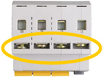 Возможность одновременного присоединения шиной Fork и гибким проводником для распределения питания цепи через верхние зажимы, а также возможность соединения шиной PIN. |