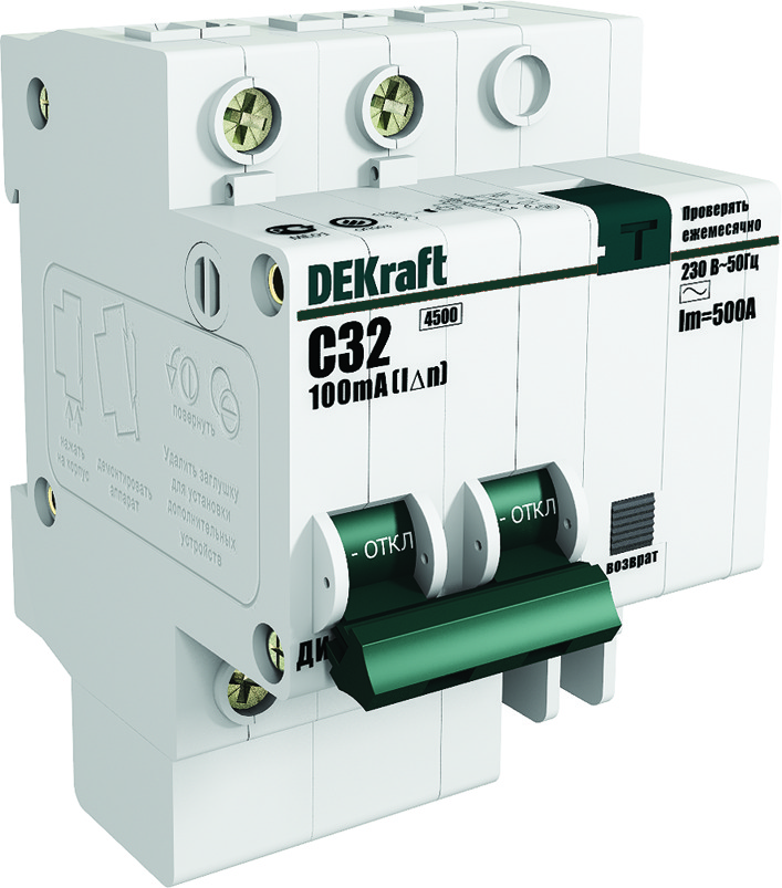 Автоматический выключатель дифференциального тока DEKraft серии ДИФ-101 со встроенной защитой от сверхтоков сочетает функции автоматического выключателя и УЗО.