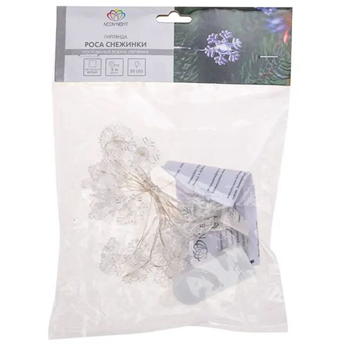 Гирлянда светодиодная нить 2 м Neon-Night 303-010 "Снежинки" (роса, 20 led, серебристый провод, IP20), цвет свечения белый