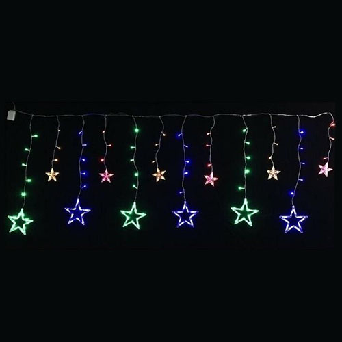 Светодиодная гирлянда бахрома SnowHouse DCLLD-138M-C состоит из основного прозрачного провода, закрепляемого горизонтально, с которого свисают отрезки провода разной длины с led-насадками в форме звезд.