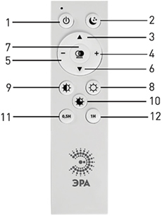 1 - включение / выключение светильника. 3 - увеличение яркости. 5 - уменьшение цветовой температуры. 7 - переключение цветовой температуры (3400 К - 4200 К - 5500 К) - при этом светильник будет светить с максимальной яркостью. 9 - яркость светильника - 50%. 11 - установка таймера отключения на 30 минут (автоматическое отключение светильника через 30 мин.). |