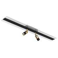 Прозрачный акрил со светодиодной подсветкой пересекает элегантно строгая черная полоса, на которой крепятся два поворотных спота золотого оттенка.