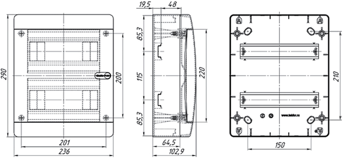 Выдавливаемые отверстия для подведения кабеля сбоку выполнены с внутренней стороны, что позволяет сохранить гладкой внешнюю поверхность щита. |