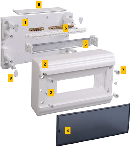 1 - основание. 3 - замок-защелка. 5 - суппорт с шинами N / PE. 7 - пластиковые винты. 9 - вставка для ввода труб и кабелей. |