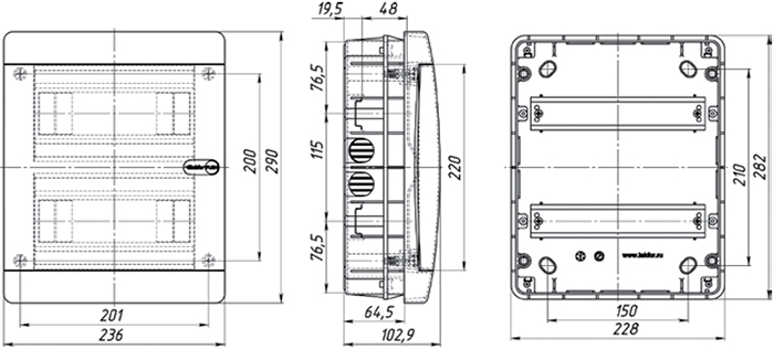 Крышка щита имеет выдавливаемые элементы под дополнительные модульные устройства. |