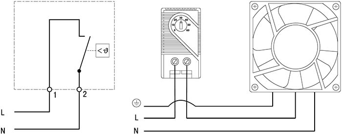Термостат одноканальный NO предназначен для управления вентилятором с целью поддержания заданной температуры и влажности внутри электротехнического шкафа и организации стабильной работы установленного активного оборудования.