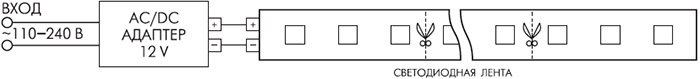 - При соединении соблюдайте полярность, соответствующую маркировке контактов на ленте и источнике питания.