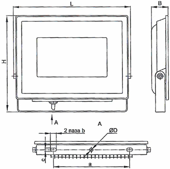 - Монтаж производится путем крепления скобы прожектора на монтажную поверхность при помощи двух крепежных элементов (анкеры, болты или шпильки с гайками, плоскими и пружинными шайбами).