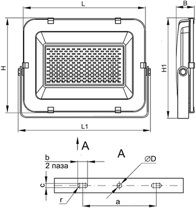 - Монтаж прожектора производится путем крепления скобы прожектора на монтажную поверхность при помощи двух крепежных элементов (анкеры, болты или шпильки с гайками, плоскими и пружинными шайбами).