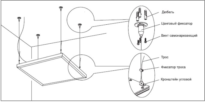 - Конструктив светильника предусматривает встраиваемый, подвесной и накладной способы монтажа (комплекты крепежей приобретаются отдельно).