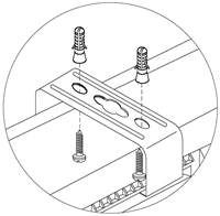 Для этого необходимо при помощи самонарезающих винтов и дюбелей закрепить две монтажные скобы на стене или потолке и защелкнуть в них корпус светильника.
