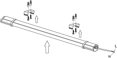 - Для монтажа необходимо закрепить две монтажные скобы на стене или потолке и защелкнуть в них корпус светильника.